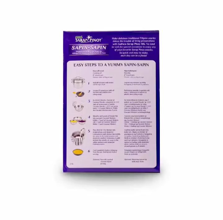 Sarap Pinoy Sapin-Sapin food mix is a pre-packaged mix that allows you to easily prepare the traditional Filipino layered rice cake, sapin-sapin, at home. It combines the necessary ingredients like glutinous rice flour, sugar, and flavors (such as ube, jackfruit, and coconut) into one product, so you don't have to measure out each component separately. By adding liquids like coconut milk and water, you can create the distinct, colorful layers of the dessert.